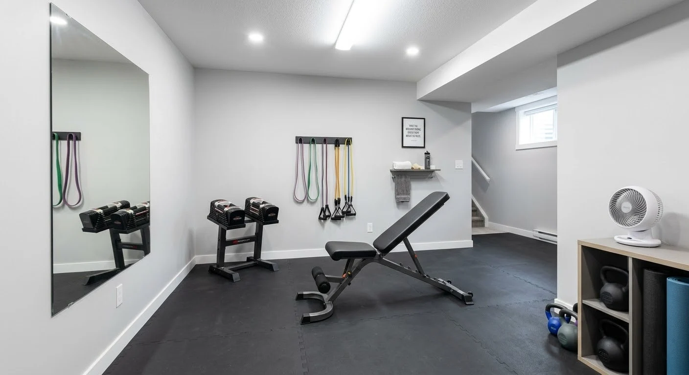 A basic but fully functional basement gym can come together for $200 to $500 if you’re smart about it. That covers foam or rubber flooring for a small area, a set of resistance bands, adjustable dumbbells or a pull-up bar, and a fan. It’s not glamorous, but it gets you moving.