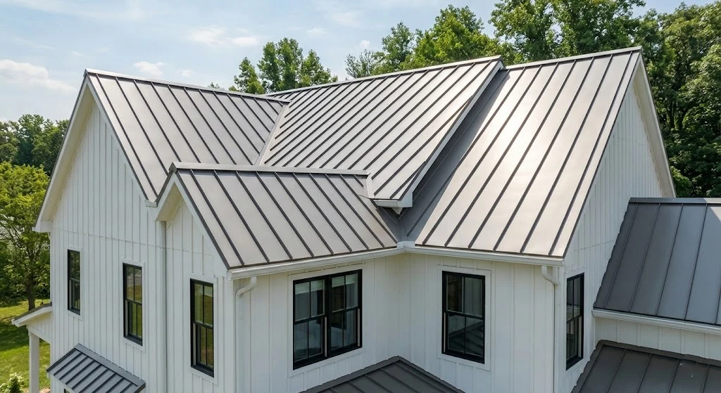 When we talk about a “modern” metal pewter roof, we are also talking about the profile of the metal. Old-fashioned metal roofs often looked like corrugated tin on a barn—wavy and rusted. The modern version is sleek. The standing seam profile features flat panels with clean, straight ribs running from the ridge to the eaves. This linear look is very architectural. It draws the eye upward and makes a home look taller and more substantial.